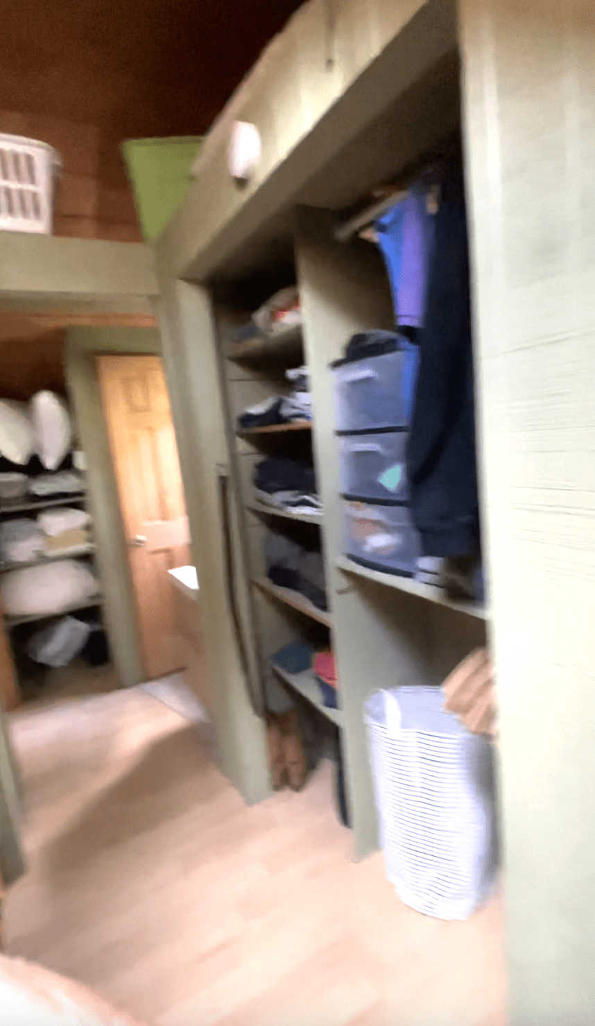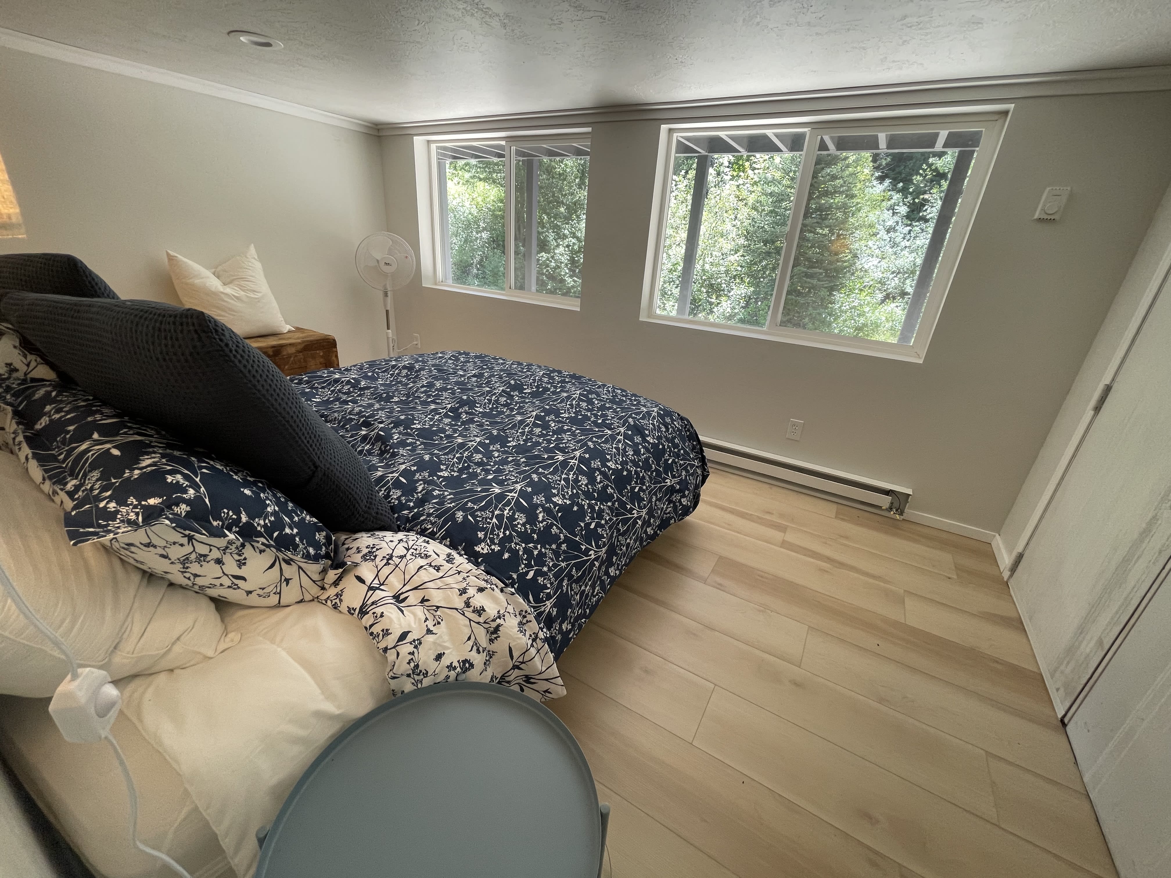 This is the cabin that wasn't finished. I really wanted this cabin to be insulated but the contractors didn't do it in time. I had to get it ready for Jared's family. We spent two days cleaning it and bringing beds inside of it. We bought air conditioners for the two bunk houses and there were extra fans. I am hoping to get the upstairs done by next year and add a TV and couch to keep the little kids inside the cabin until everyone is awake. Jared's siblings are free range parents and I am not. I was super worried that some wild animal would hurt them or they would fall into the pond.