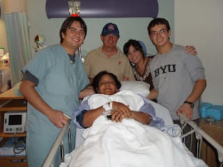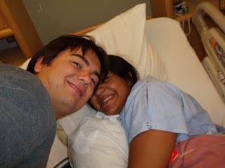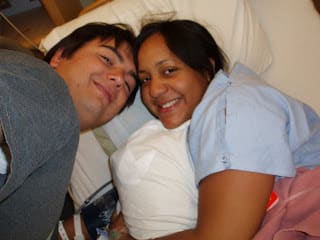 After spending some time with Mario in the NICU, I went back to the recovery room to see how Jenny was doing and to tell her about our cute baby boy. I told her his weight and measurements and told her I was going to get her things and move them up to the postpartum room for her. When I got to the labor and delivery room where we were staying, I found my parents, Sam, and my aunt Jacqueline waiting there! They saw me in the scrubs and thought I was a doctor until they saw my face and realized it was me. We went to see Jenny and took some pictures.