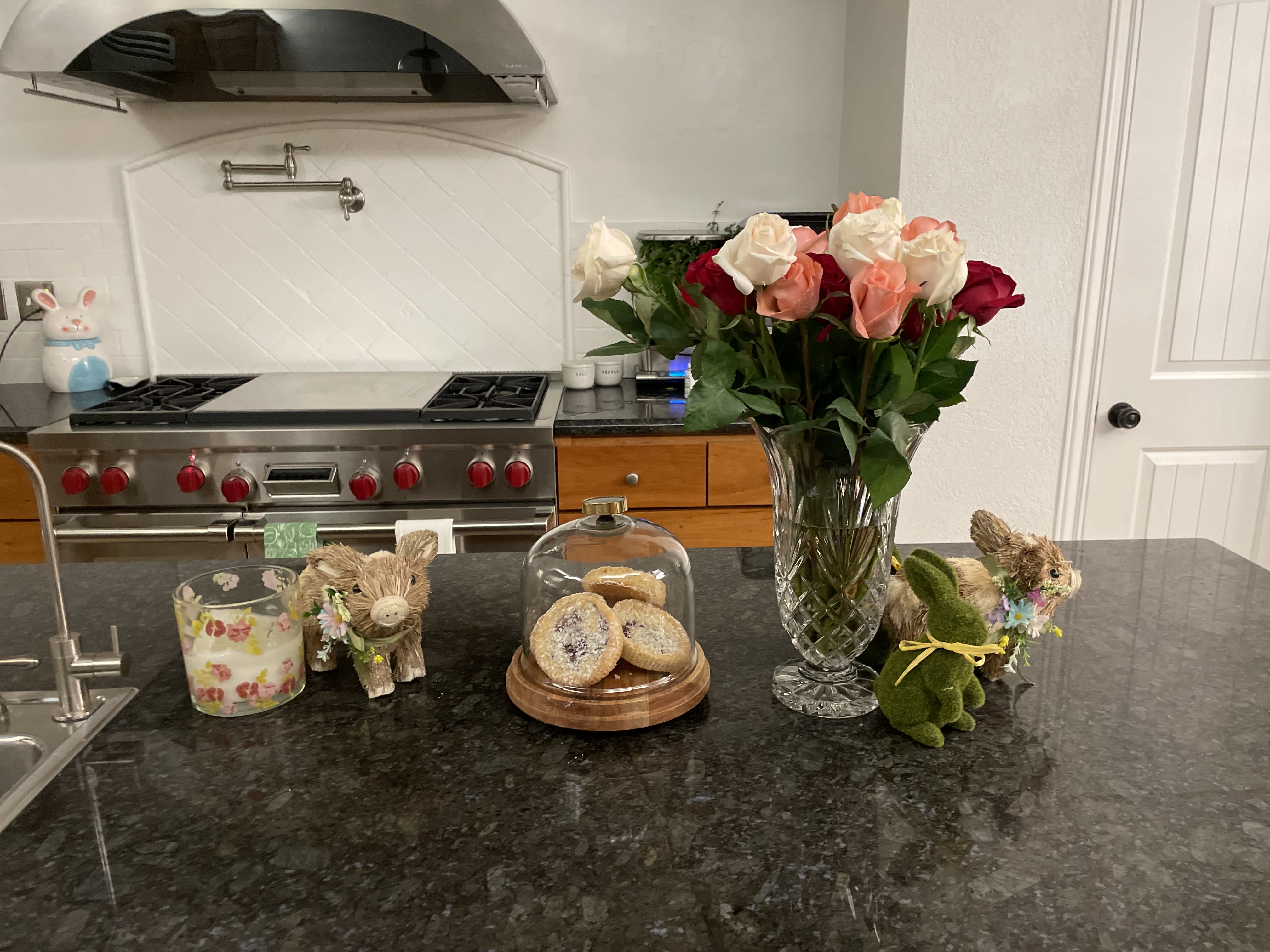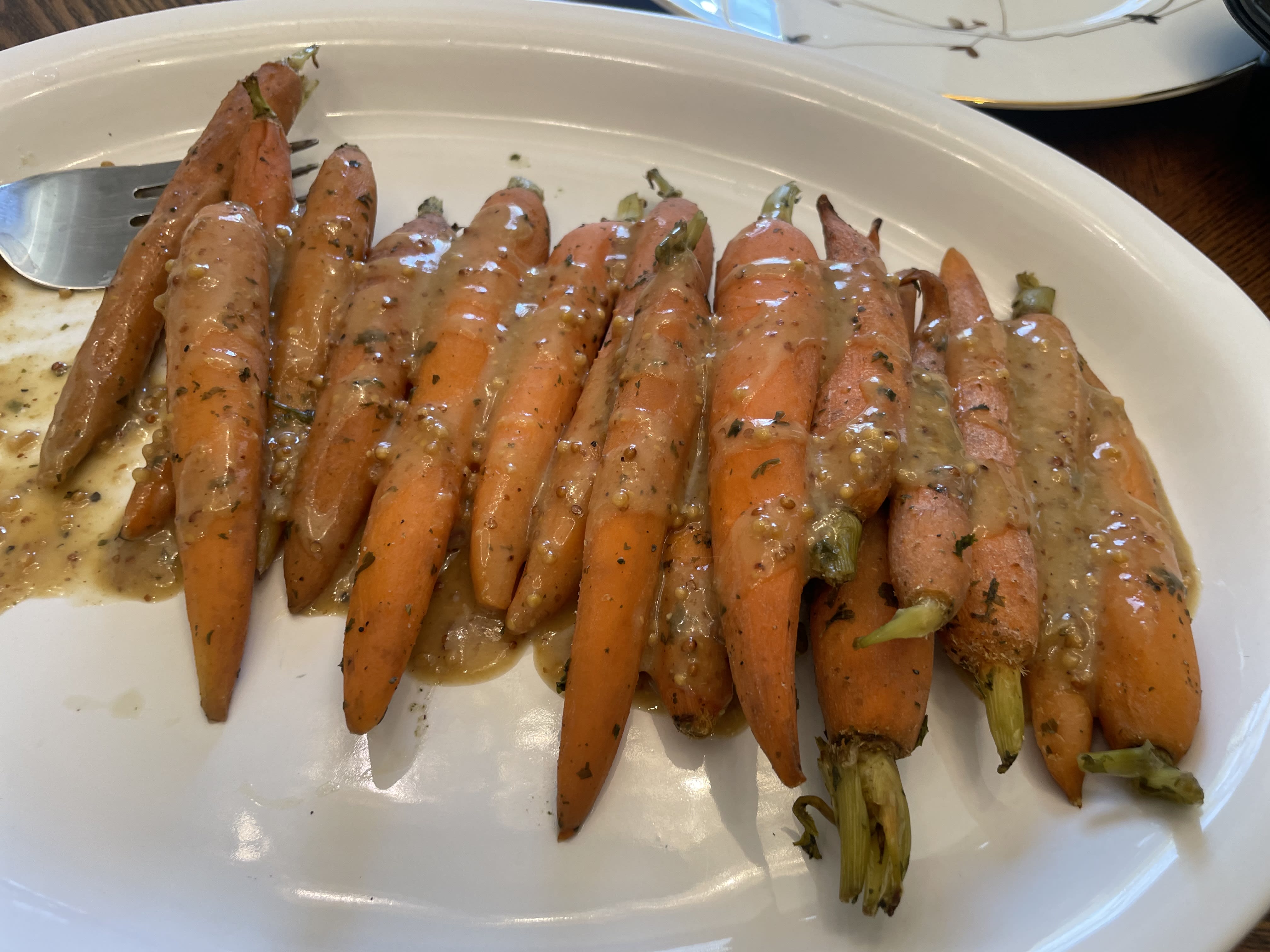 Our Easter dinner was pretty much food from Costco. We had carrots with a  maple dijon glaze, ribeye steaks, scalloped potatoes. Our dessert were macaroons made in France and Creme Brulee.