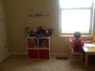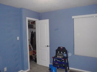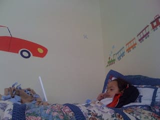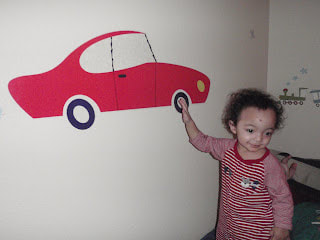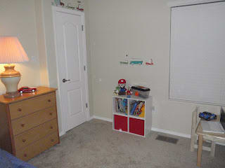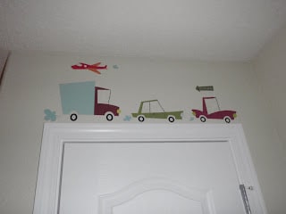 I painted the room back to a creme color. It looks like I didn't do anything to it. I got some cars, airplanes and train stickers and my boys put them on the wall. Mario is into those things.