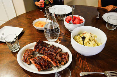 For dinner we had barbecue ribs with mashed potatoes, some vegetables, and fruit. The boys just ate fruit as they refuse to eat meat. Both of them are "vegetarians." The dinner looks amazing and it was so tasty.