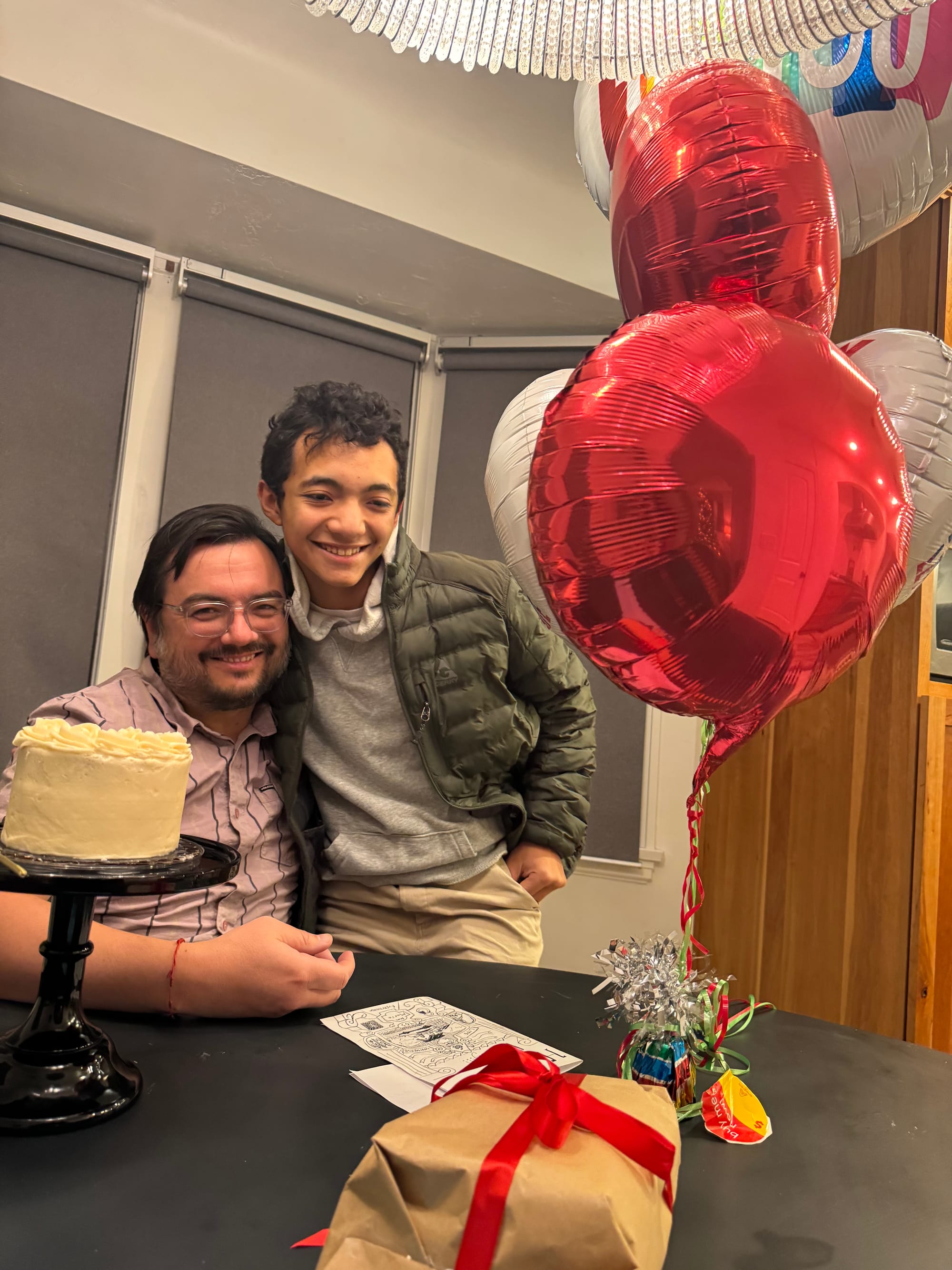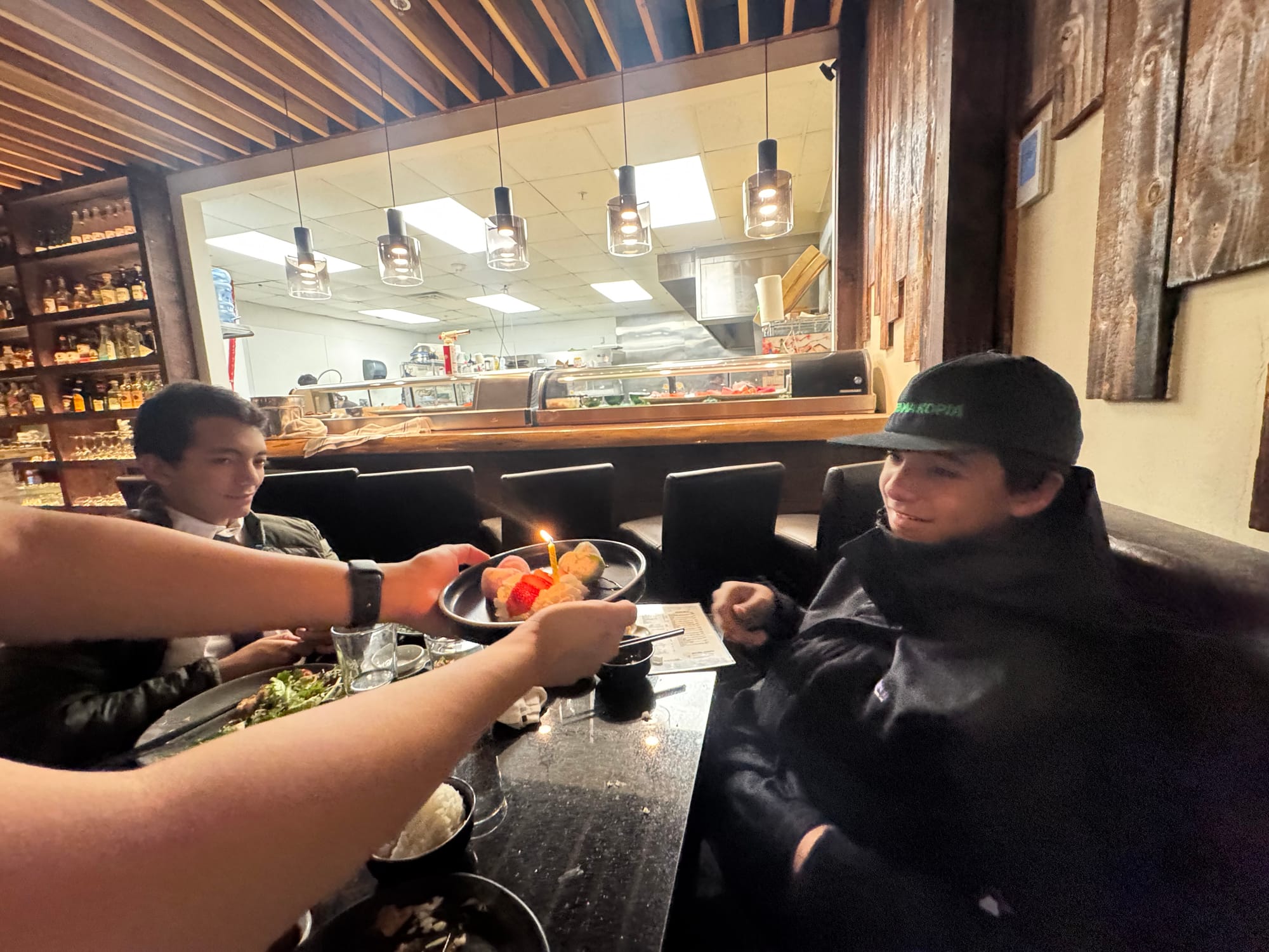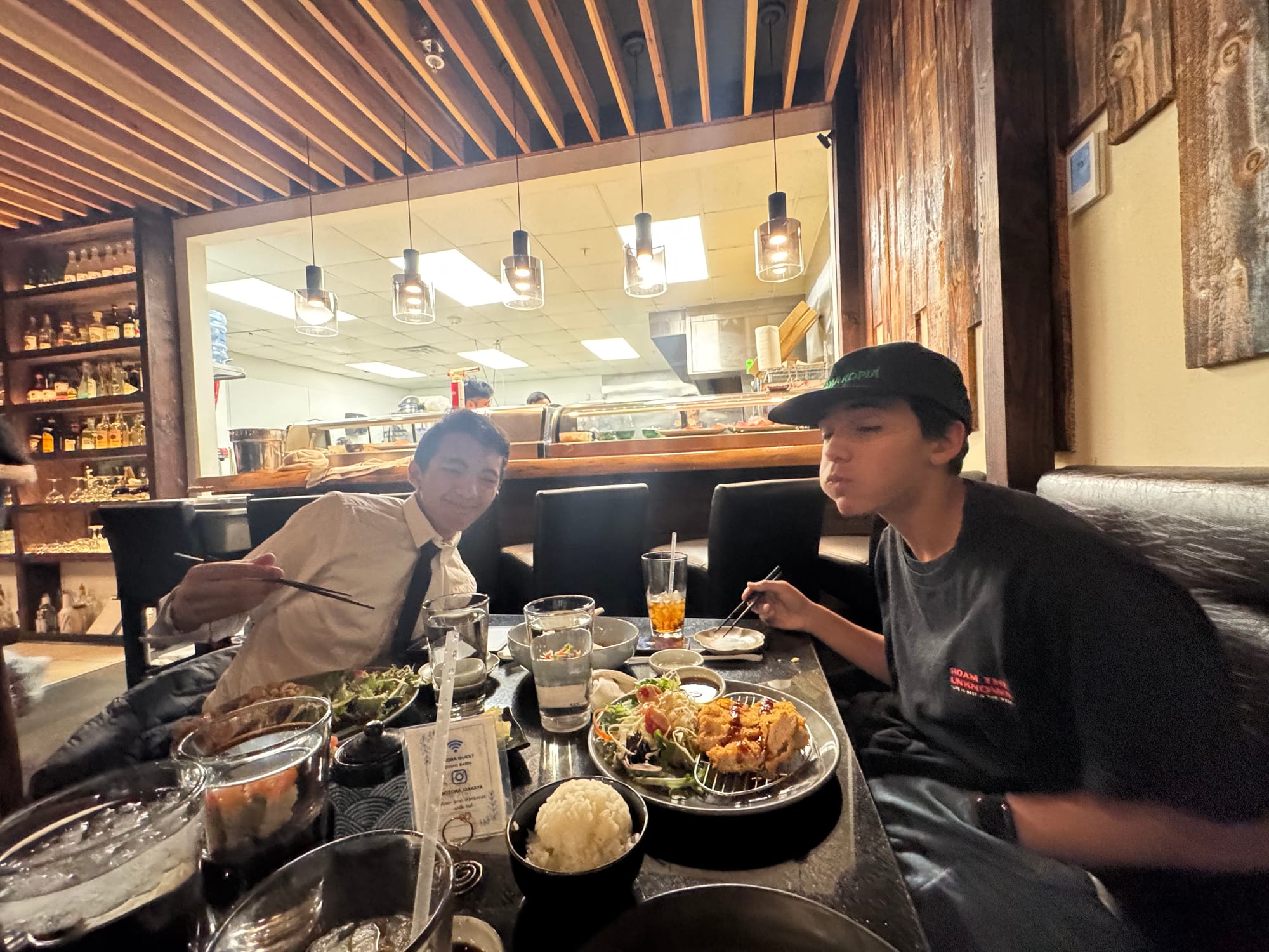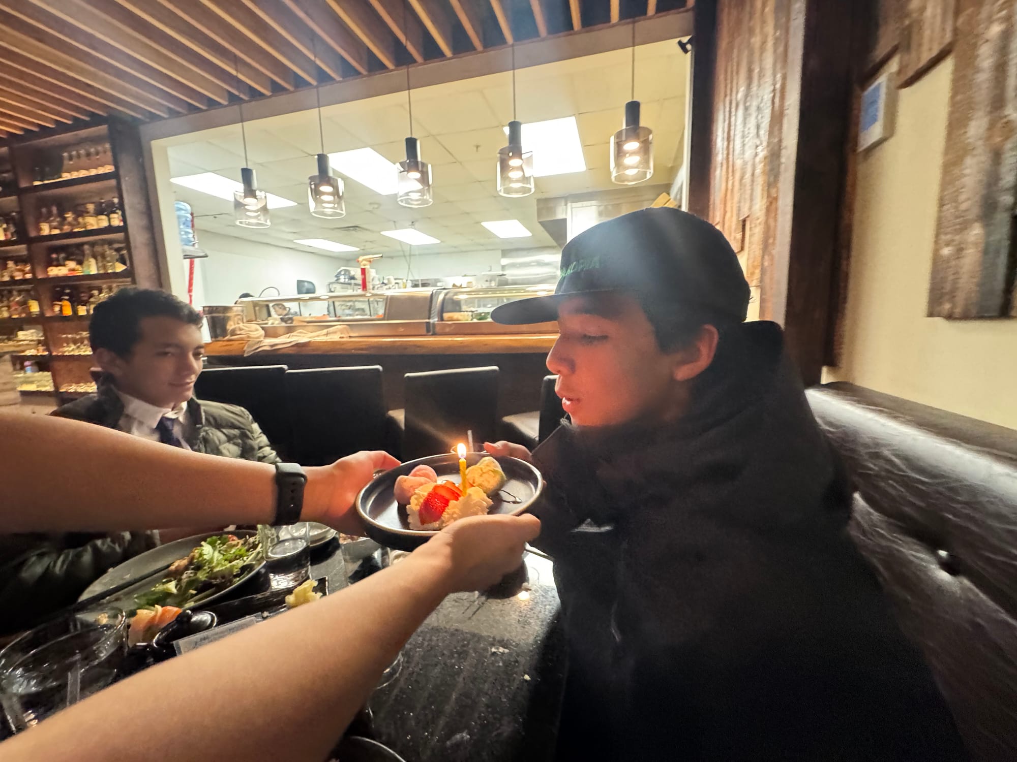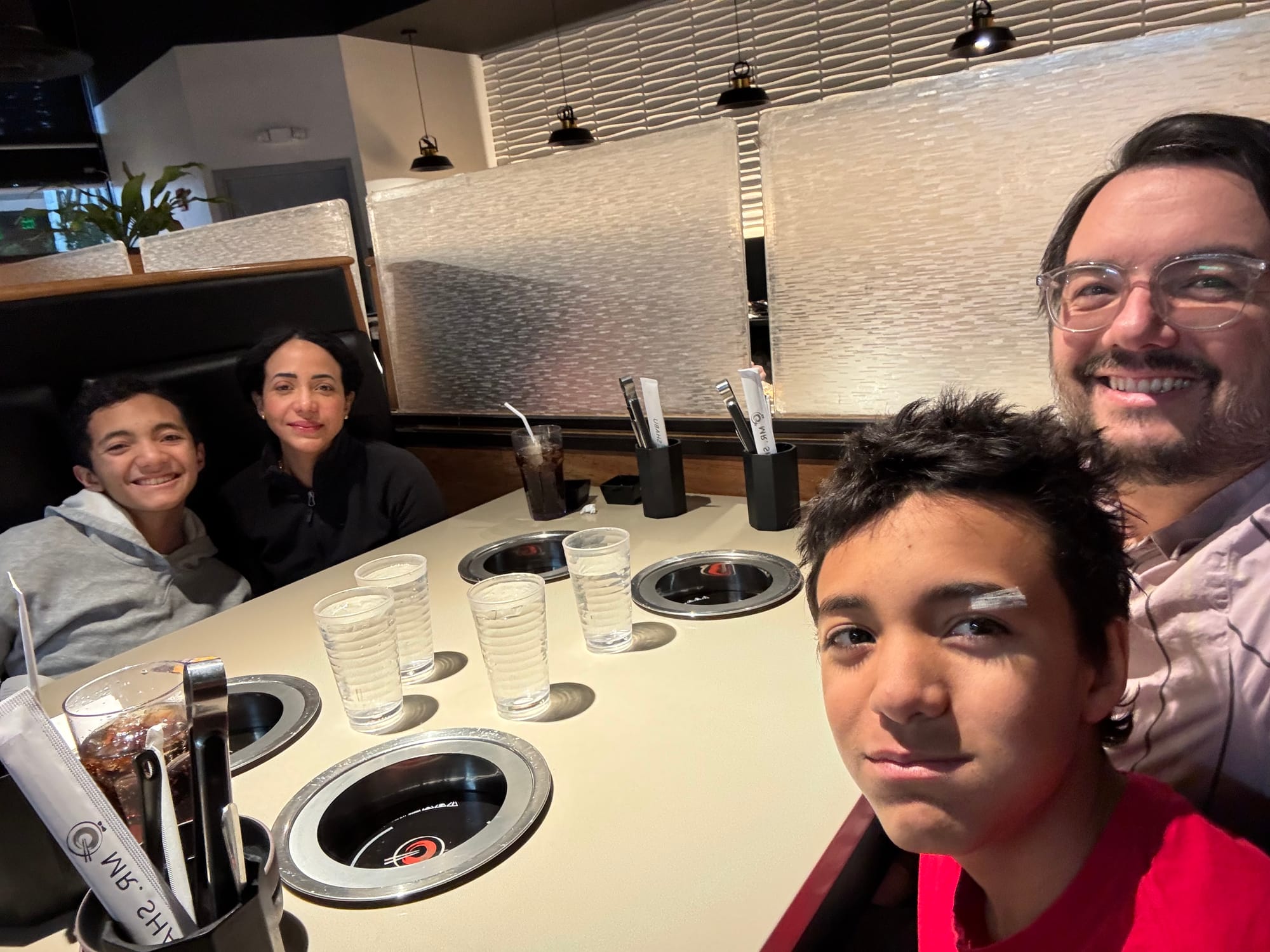 We woke up early (6am ) to celebrate Milo's birthday. Jared had to go travel to San Francisco that day and he wasn't going to be back until 11pm. We opened presents early and I took Milo to celebrate his 14th birthday at a Japanese tapas place. Our little neighbors (Leon and Nolan) made a cute card for Milo