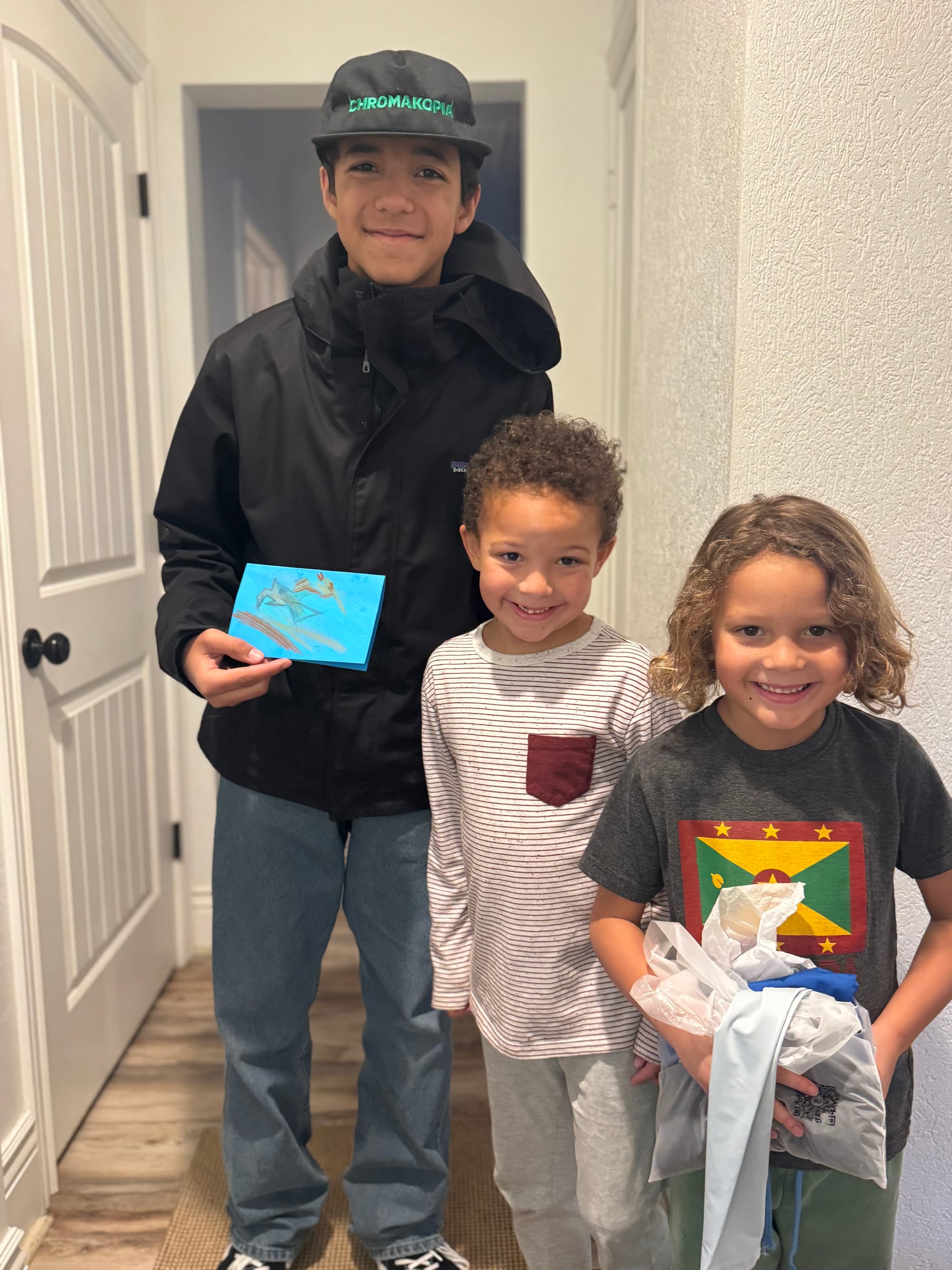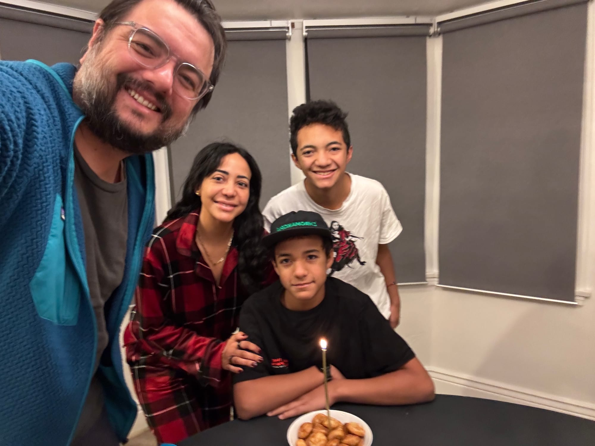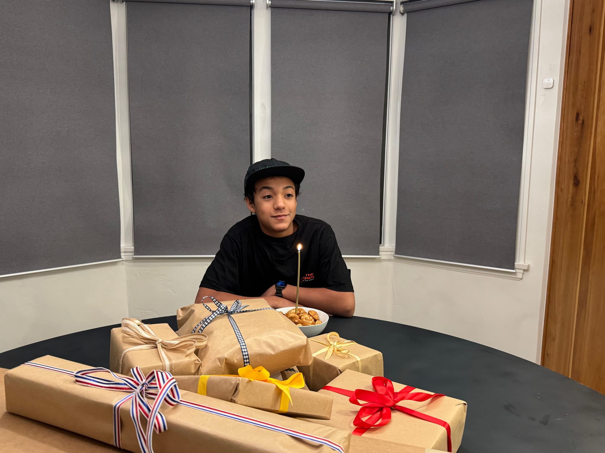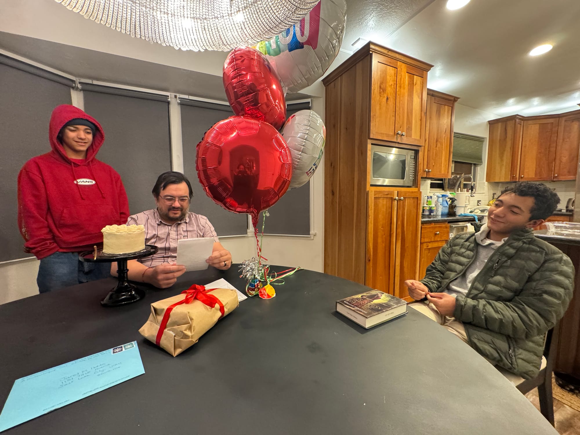 We woke up early (6am ) to celebrate Milo's birthday. Jared had to go travel to San Francisco that day and he wasn't going to be back until 11pm. We opened presents early and I took Milo to celebrate his 14th birthday at a Japanese tapas place. Our little neighbors (Leon and Nolan) made a cute card for Milo