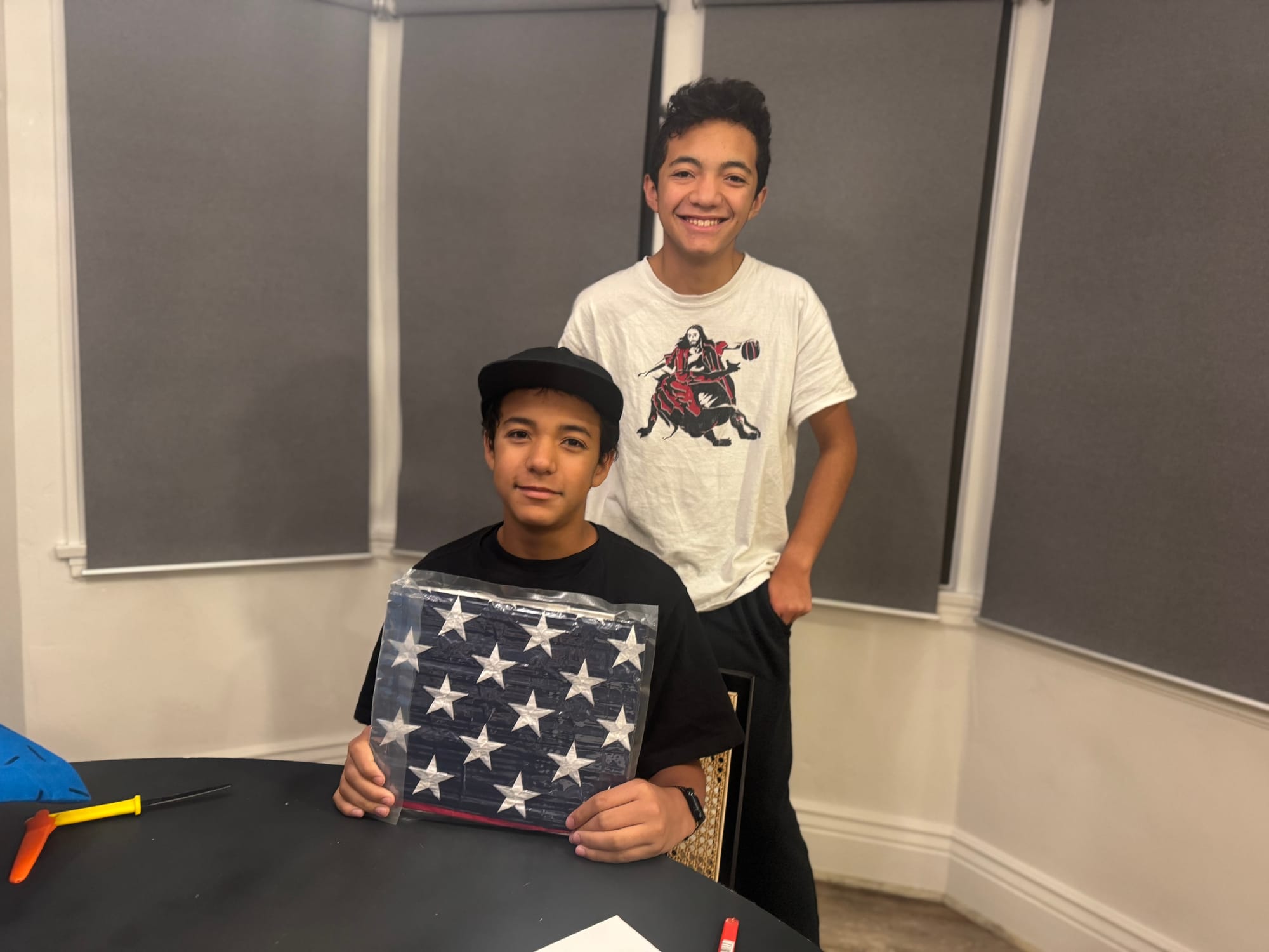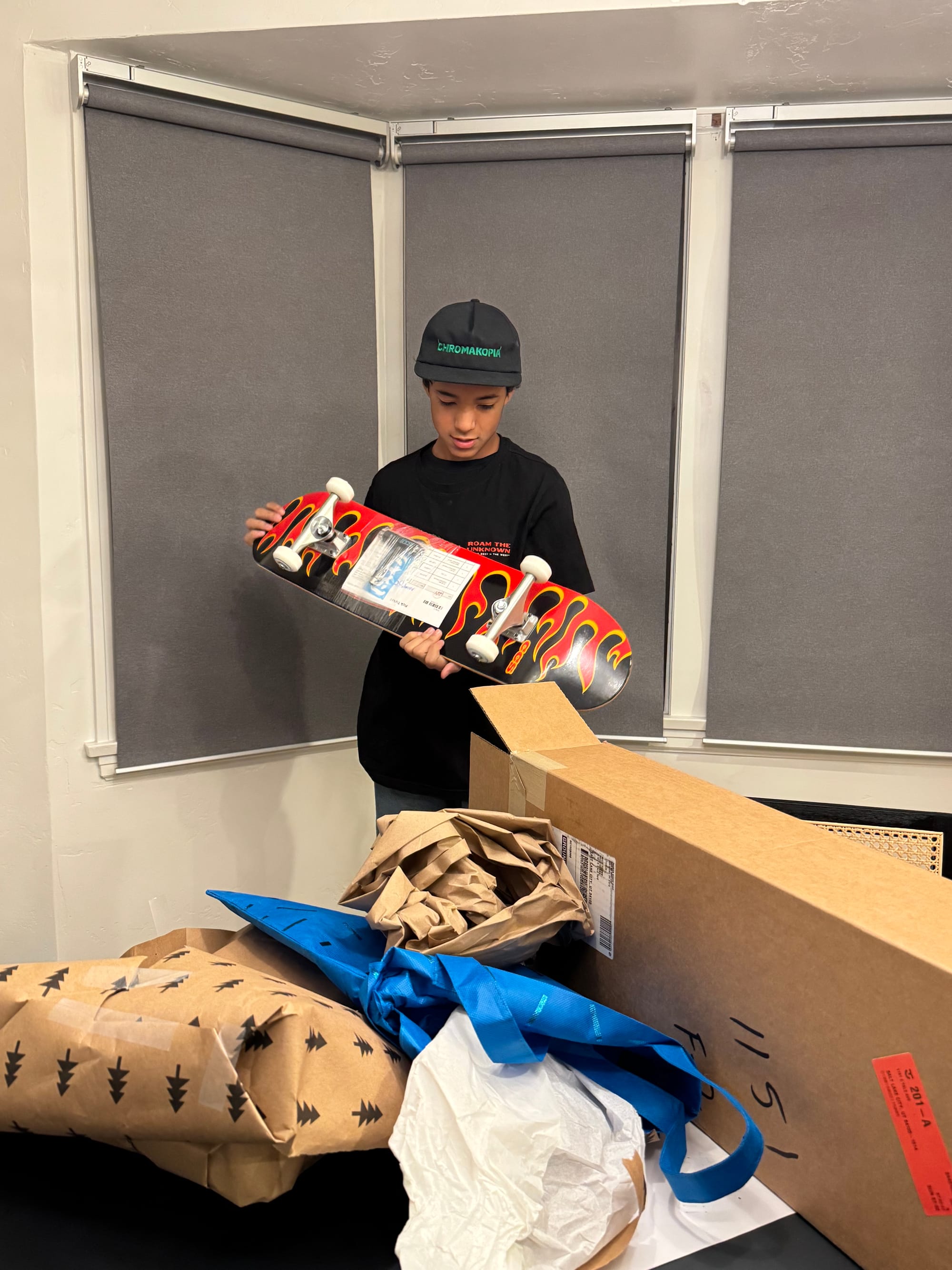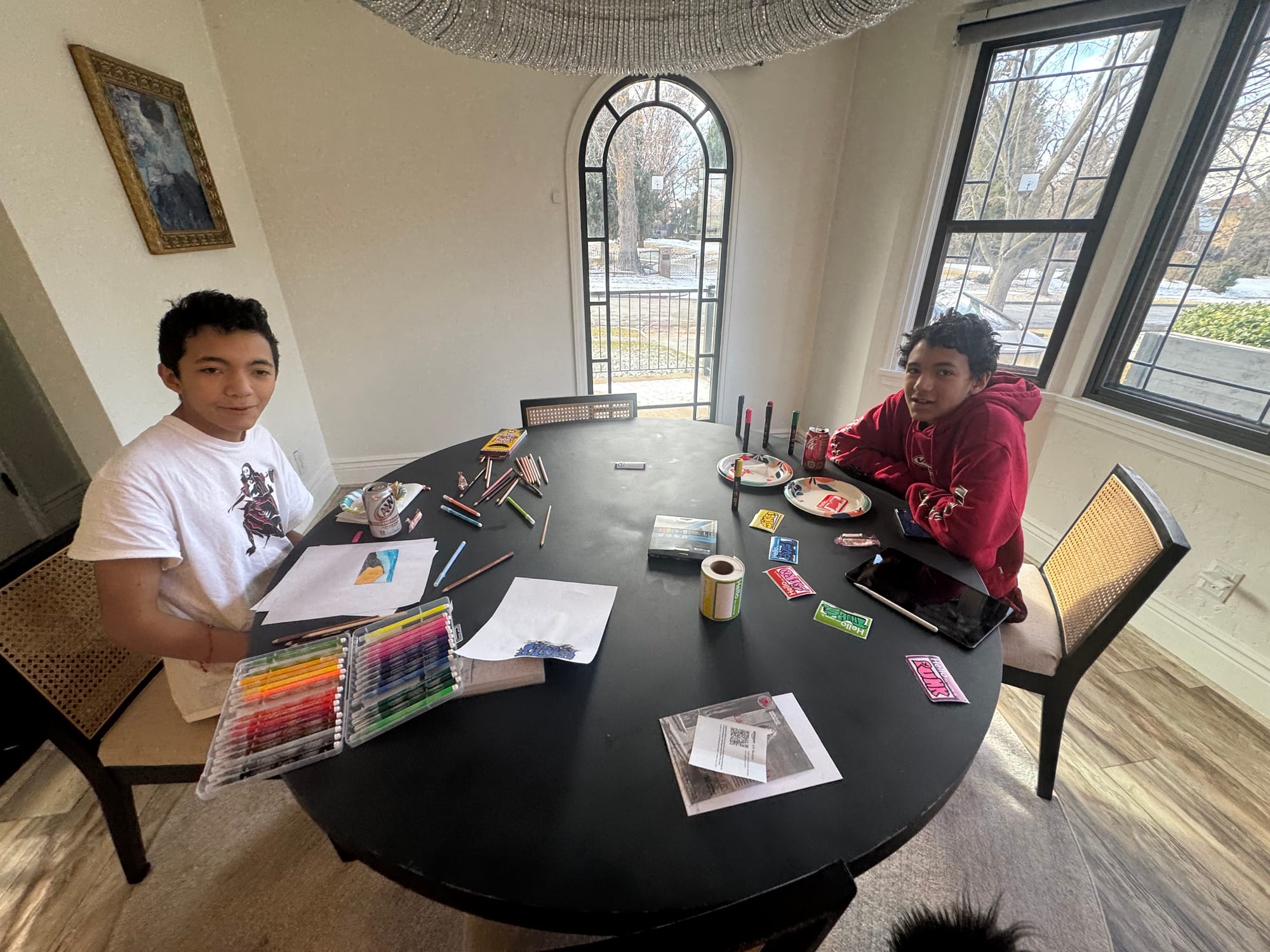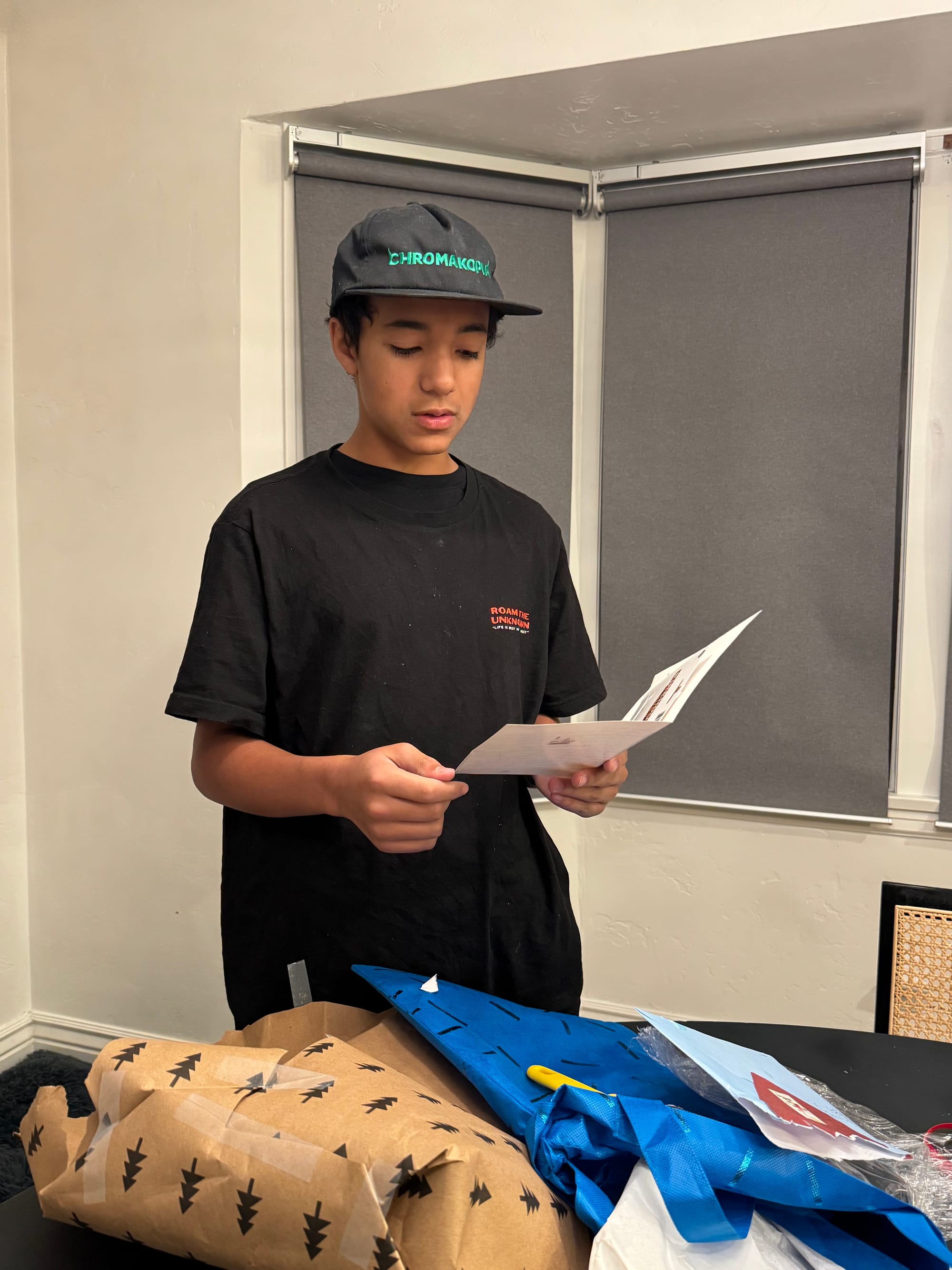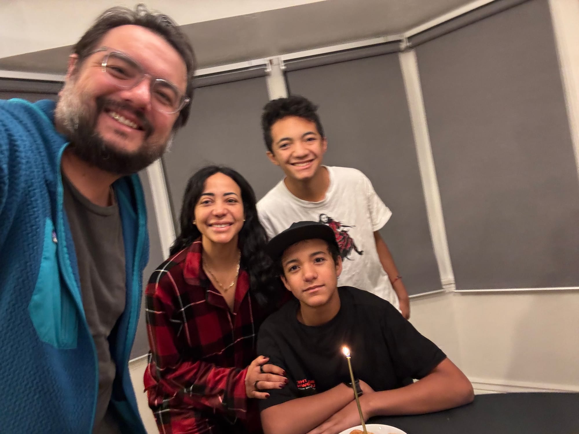 We woke up early (6am ) to celebrate Milo's birthday. Jared had to go travel to San Francisco that day and he wasn't going to be back until 11pm. We opened presents early and I took Milo to celebrate his 14th birthday at a Japanese tapas place. Our little neighbors (Leon and Nolan) made a cute card for Milo