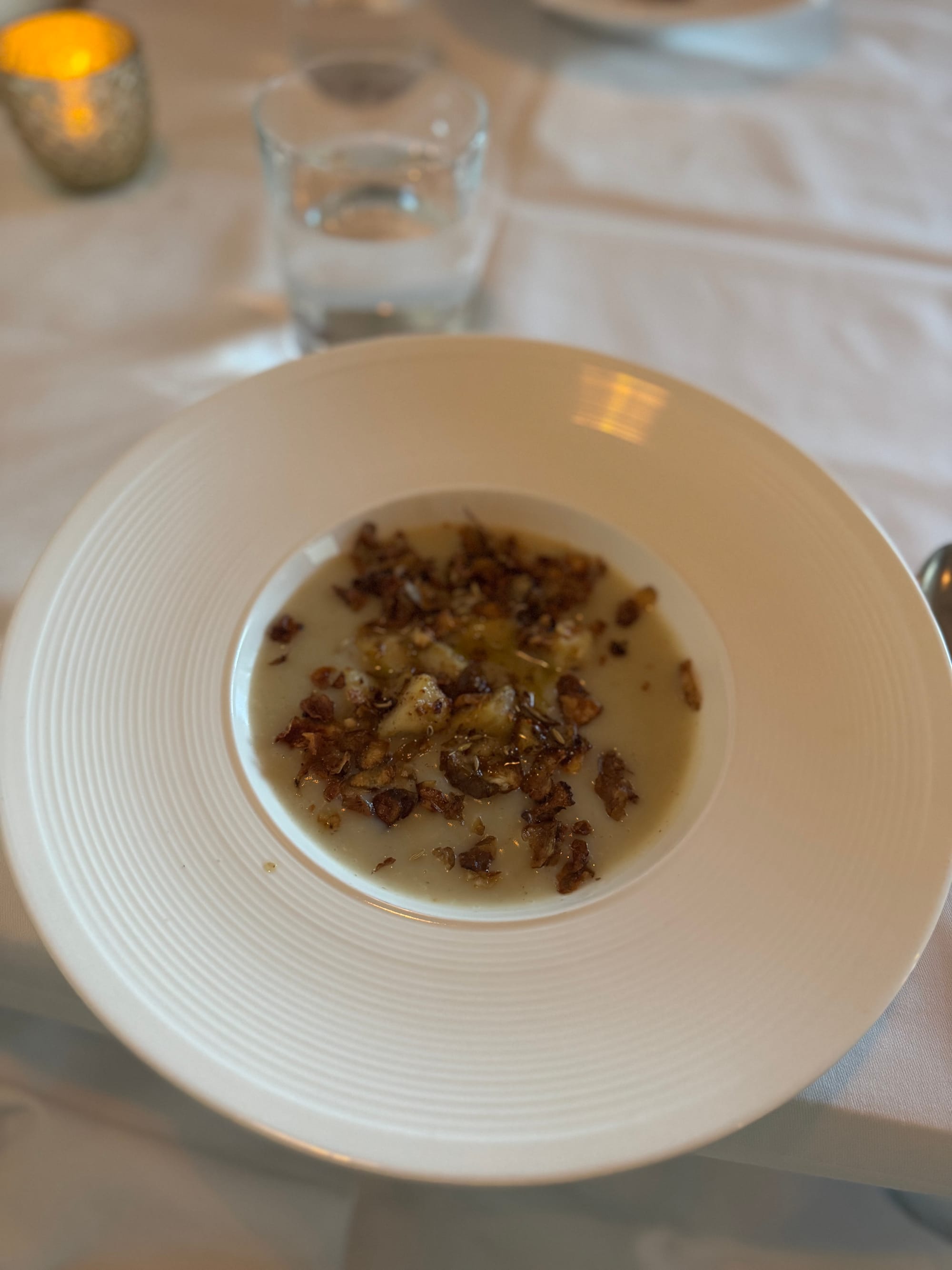 I. Vellutata Topinambur con Capesante e Nocciole e Fiori di Finocchiofennel flower sautéed scallop with jerusalem artichoke velluté and piemonte hazelnuts