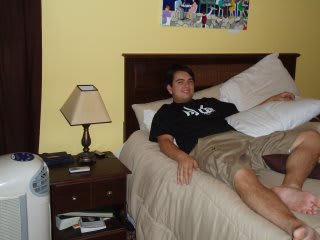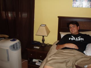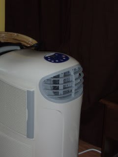 Jenny and I just bought a portable air conditioner from costco.com and it arrived yesterday. We both agree that it was one of the best investments we've made. Our house has an evaporative cooler (swamp cooler) but there is only one air duct and it's in the hallway so it effectively cools the living room and hall but the bedrooms stay in the 90's. This air conditioner is awesome. We've been running it non-stop since yesterday and our room is now a comfortable 73º F. We moved an old table into our room so Jenny can do her homework in the comfort of refrigerated air. We have a wireless router so we can also use our laptops in the nice cool room. Here're some pics: