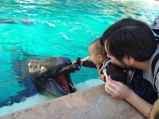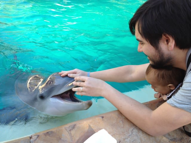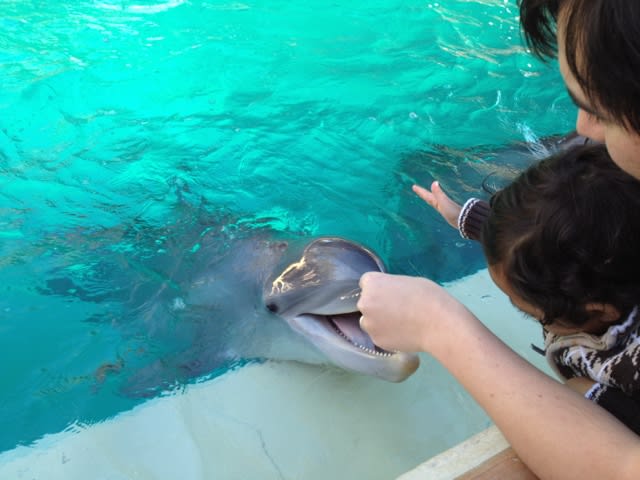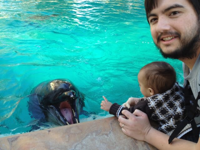 We are going to see it again tomorrow. We love the show, and we also fed the dolphins. A tiny trait full of fish $6. Milo was a natural, Mario was less trusting of the dolphins. I was super excited, the dolphin's skin felt like plastic.