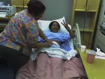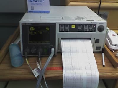 The nurse is putting the baby monitors on Jenny: