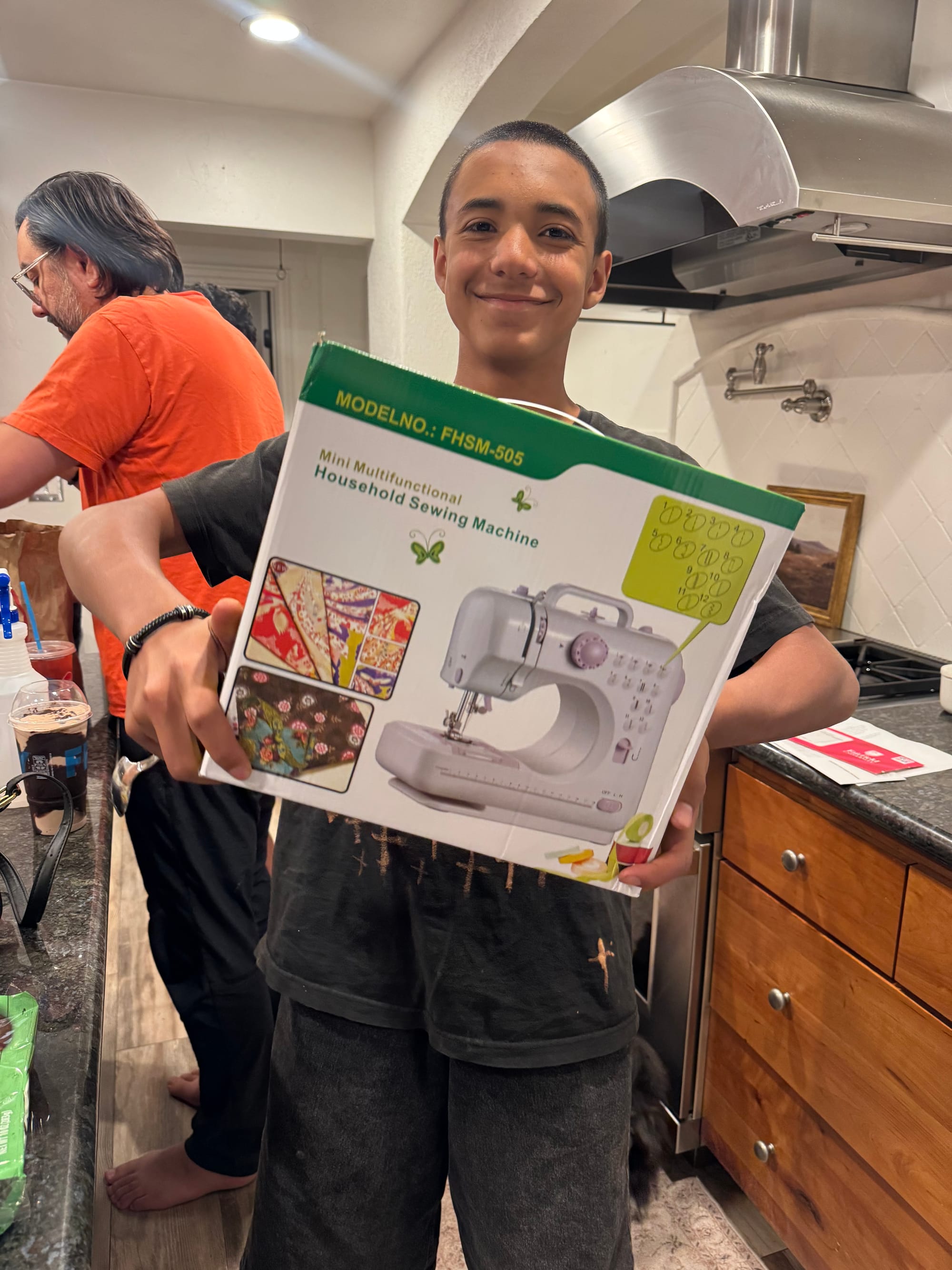 Milo kept asking to go to the thrift store to find a sewing machine, but I ended up buying him an affordable one from Amazon instead. Since then, he’s been teaching himself how to sew. He wants to design and make his own clothes. He already designed that T-shirt for Jared and the one with the cross for himself.