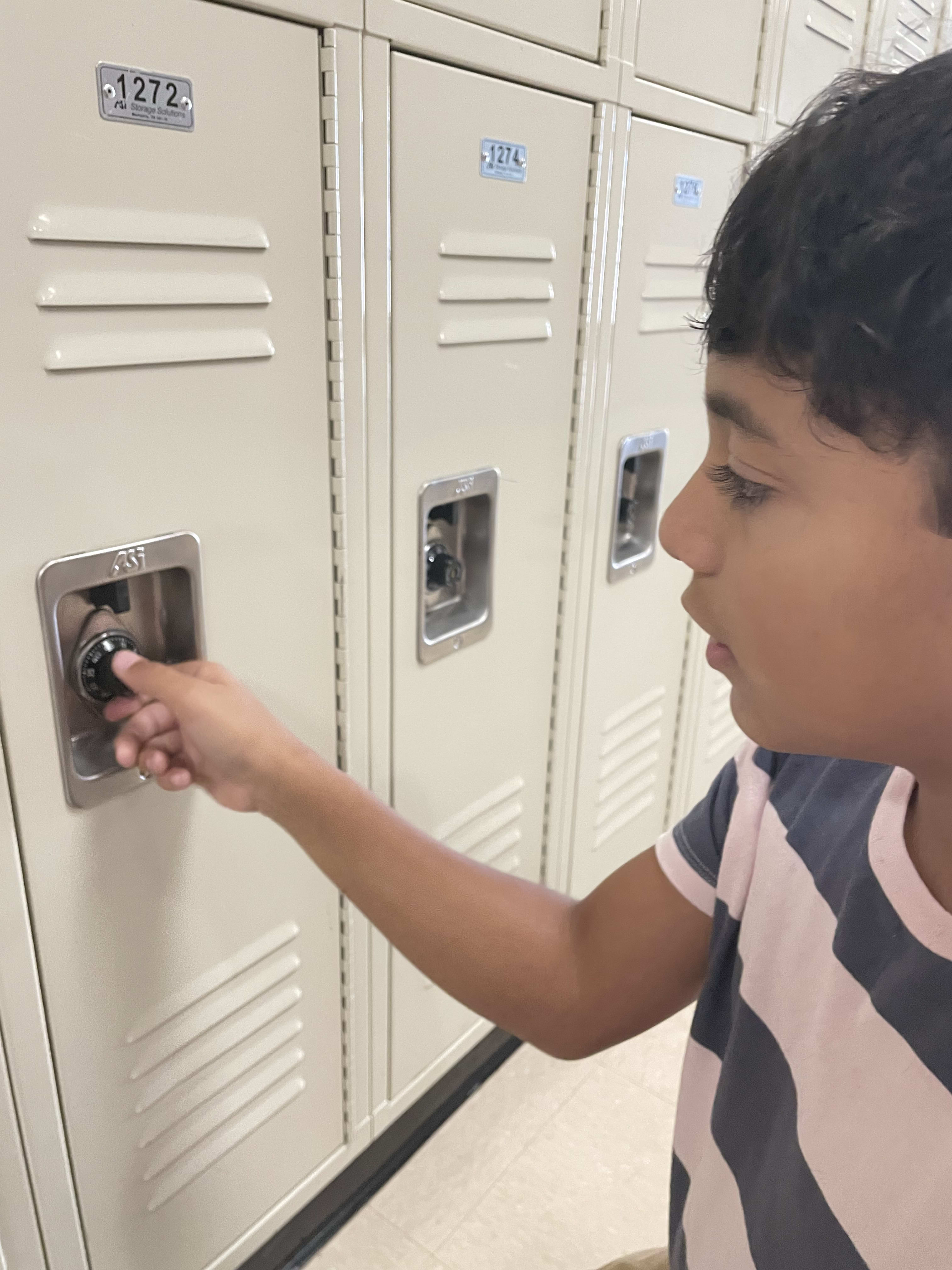Milo is officially in Middle School!! We got his class schedule and I am very impressed. First time using a real locker too!